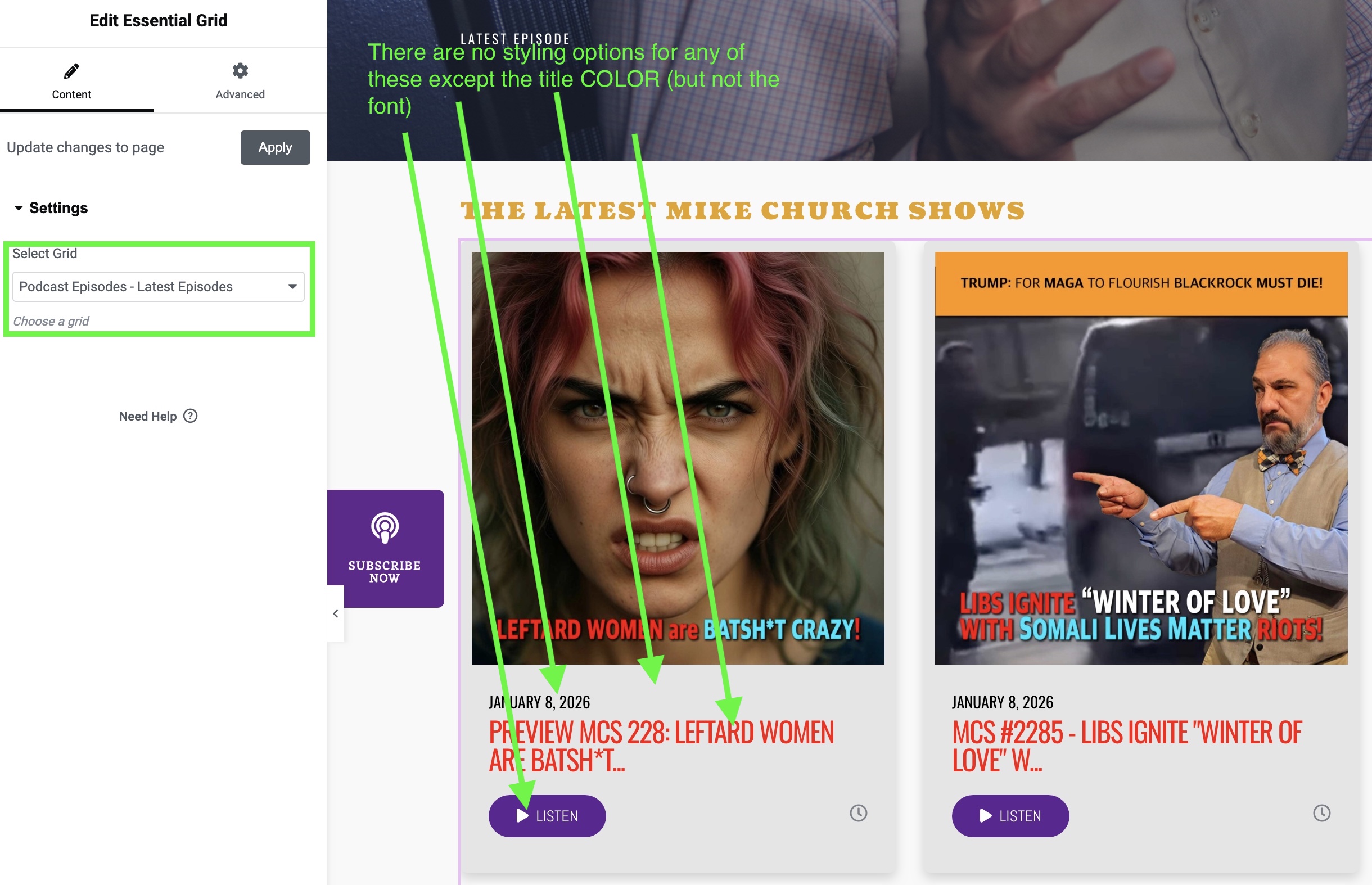 We have been stuck for 4 hours on trying to find out where we can customize the Podcasts Episode-Latest Episode grid. There's no controls the query, the number of columns, the colors, fonts or backgrounds that we can find. Are we stuck with whatever the default is on a grid? I've enclosed a screenshot of the problem area.