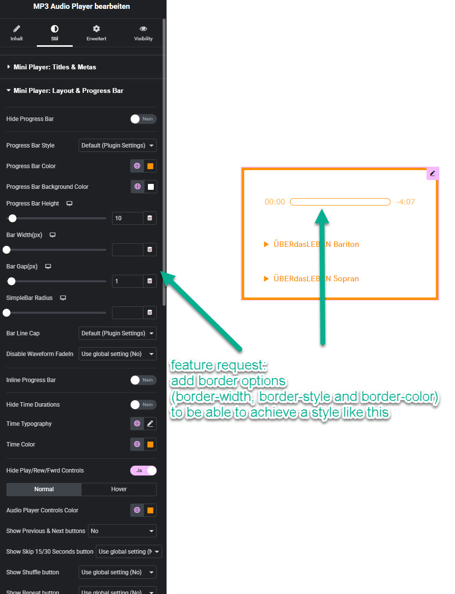 I would like to raise a feature request. Please consider adding an option to apply a CSS border (border-width, border-style, and border-color) to the progress bar of the MP3 Audio Player widget for Elementor. Currently, I need to add custom CSS to achieve the styling you can see in the attached screenshot. With the border setting it would be easier and I could use global colors (well, I can with CSS but I have to hassle with the weird naming of Elementor CSS variables). It’s not very urgent, though. I would rather consider this a quality of life improvement.